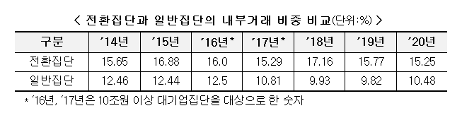전환집단 소속 지주회사(27곳)에 대한 총수 및 총수 일가의 평균 지분율은 각각 26.3%, 49.5%로 여전히 높은 수준을 보였다. 이들 집단의 계열사 간 내부거래 비중(총 매출액에서 내부거래액이 차지하는 비중)은 평균 15.25%로 전년(15.77%)과 유사하지만 일반집단(10.48%)보단 현저하게 높았다.