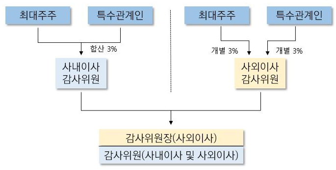 여기까지는 아직 큰 이슈가 없다. 막상 주총에 들어가면 민감해지는 이슈는 지금부터다. 현행법상 감사나 감사위원은 회사나 지배주주에게서 강력한 독립성이 요구되므로 최대주주와 특수관계인은 주주총회에서 의결권이 3%로 제한된다. 최대주주의 지분이 많은 회사이거나 기관투자자 지분을 확보하지 못한 회사의 경우 주주총회에서 정족수 미달 사례가 종종 발생하는 소위 ‘3%룰’이다. 이때 많은 이해관계자들을 다소 혼란스럽게 하는 법 규정이 바로 ‘개별 3% vs. 합산 3%’ 룰이다. 그런데 원리를 따져보면 쉽다. 감사위원 중 ‘사내이사인 감사위원’을 선임하는 경우에는 가장 강력한 독립성이 요구될 것이다. 따라서 ‘합산 3%’로 제한된다. 하지만, ‘사외이사인 감사위원’을 선임하는 경우에는 사외이사 본연의 역할에 집행뿐 아니라 견제도 포함되므로 ‘개별 3%’까지 완화된다. 그런데 회사에서 이러한 문제를 완화하려면 사외이사를 모두 자기편(?)으로 선임하면 된다. 이러한 맥락에서, 금융회사의 경우 ‘감사위원이 되는 사외이사 중 최소 1명’은 반드시 다른 이사와 ‘분리선임’하도록 하고, 이번 상법 개정안에서도 같은 내용이 편입돼 통과 시 일반 회사도 적용된다. 재계의 입장에서는 행동주의 펀드들이 추천한 감사위원의 과도한 간섭 문제를 우려하여 “왜 똑같은 이사를 분리 선임하나?”, 반대로 지배주주의 사익편취가 우려되는 경우 “감사위원 분리선임을 왜 1명밖에 안 하나?” 등 이해관계에 따라 첨예하게 대립할 수밖에 없다. 이러한 사정으로 상법 개정안에서는 상장회사가 감사 또는 감사위원을 선임/해임하는 경우 ‘사외이사’ 여부를 불문하고 최대주주는 특수관계인 등을 합산하여 3%, 일반 주주는 3%를 초과하는 주식에 대해 의결권을 행사하지 못하도록 ‘일원화’했다.