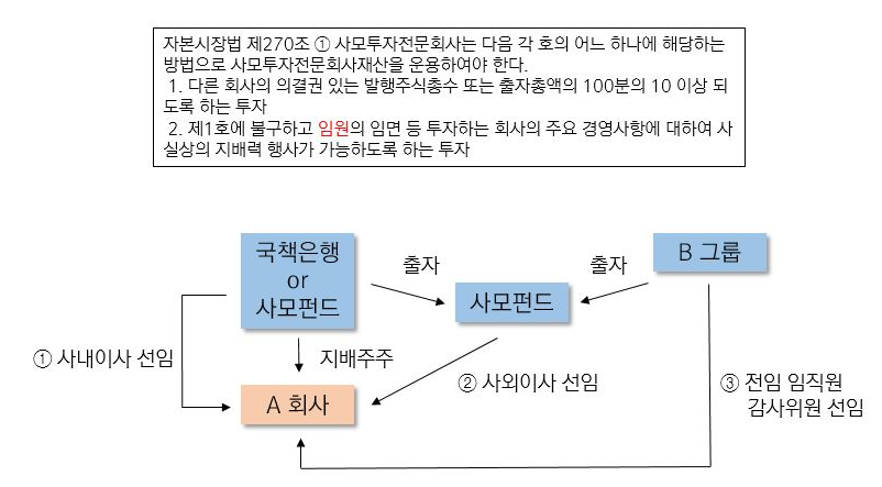 최근 사모펀드와 국책기관의 관여 활동이 급증하는 추세 관련해서 정리되지 않은 이슈도 있다. 국책은행이나 사모펀드에서 기업에 출자하고 이사를 직접 파견해 경영에 관여하고자 할 때, 지배주주이므로 원리상 사내이사를 파견하는 것이 맞다. 하지만, 실제 사례들을 보면 사내이사나 기타 비상무이사뿐 아니라 사외이사를 파견하거나 때로는 한두 단계(쿠션)를 거쳐 이해관계자를 감사위원으로 파견하기도 한다. 자본시장법상에는 이를 모두 포괄할 수 있는 ‘임원’의 임면이라고 다소 모호하게 정의되어 있다. 독립성 차원에서 충분히 이의를 제기할 수 있는 부분이다. 다만, 실무상으로 대규모 적자 회사를 회생해야 하는 경우나 사업의 재편으로 지배주주의 책임으로 직접 구조조정을 수행해야 하는 경우 그 필요성을 인정할 수 있다. 애초 ‘경영 참여’를 목적으로 설립한 사모펀드이므로 독립성 결격 사유만으로는 볼 수 없기 때문이다.