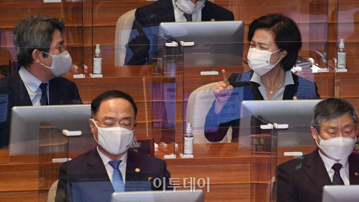 추미애 법무부장관이 19일 국회에서 열린 본회의에서 이인영 통일부장관과 대화하고 있다.