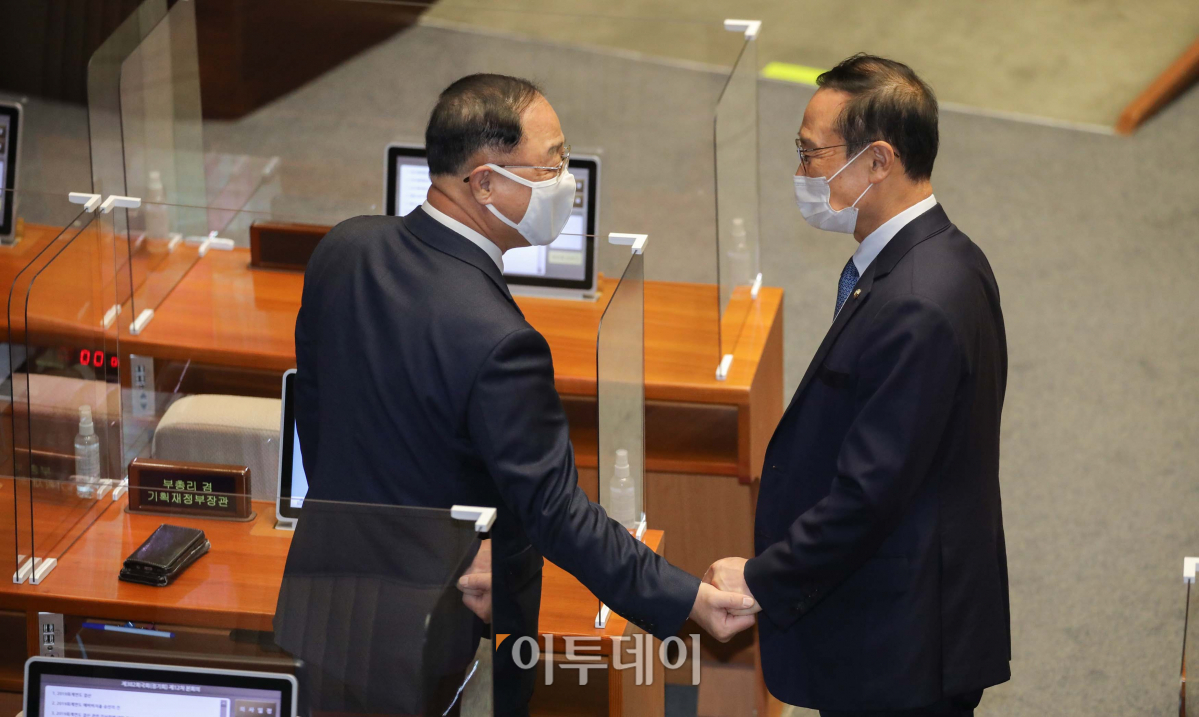홍남기 부총리 겸 기획재정부 장관, 홍영표 더불어민주당 의원이 19일 오후 서울 여의도 국회에서 열린 제12차 본회의에서 인사를 나누고 있다.