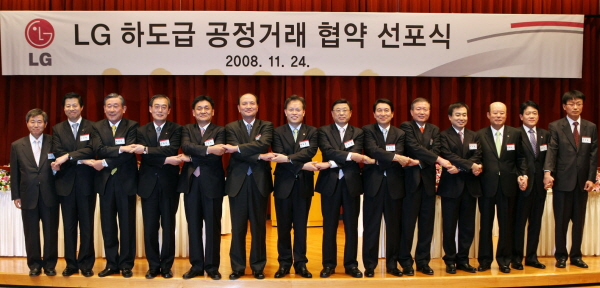 LG그룹은 24일 여의도 본사에서 LG전자 LG화학 등 6개 계열사 대표와 하도급 협력회사 대표, 백용호 공정거래위원장 등이 참석한 가운데 ‘LG 하도급 공정거래 협약 선포식’을 개최하고 상생협력을 강조했다.