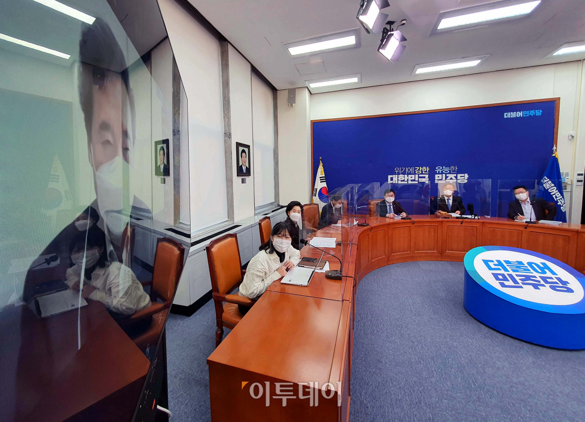 23일 서울 여의도 국회에서 열린 더불어민주당 최고위원회의에서 이낙연 대표가 화상으로 모두발언을 하고 있다. 이날 민주당 최고위원회의는 이 대표의 자가격리로 화상으로 개최됐다.