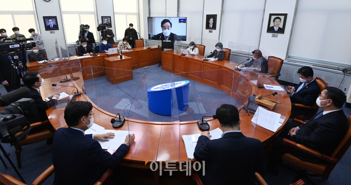 23일 서울 여의도 국회에서 열린 더불어민주당 최고위원회의에서 이낙연 대표가 화상으로 모두발언을 하고 있다. 이날 민주당 최고위원회의는 이 대표의 자가격리로 화상으로 개최됐다.