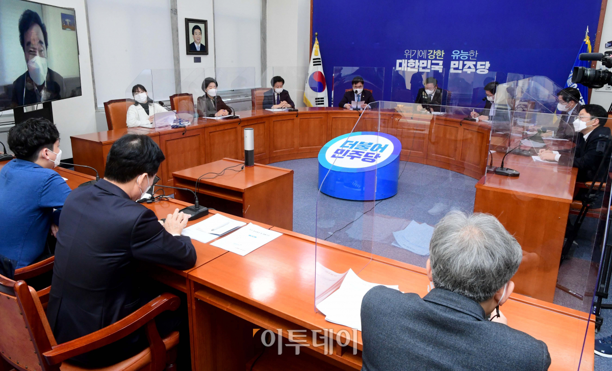 23일 서울 여의도 국회에서 열린 더불어민주당 최고위원회의에서 이낙연 대표가 화상으로 모두발언을 하고 있다. 이날 민주당 최고위원회의는 이 대표의 자가격리로 화상으로 개최됐다.