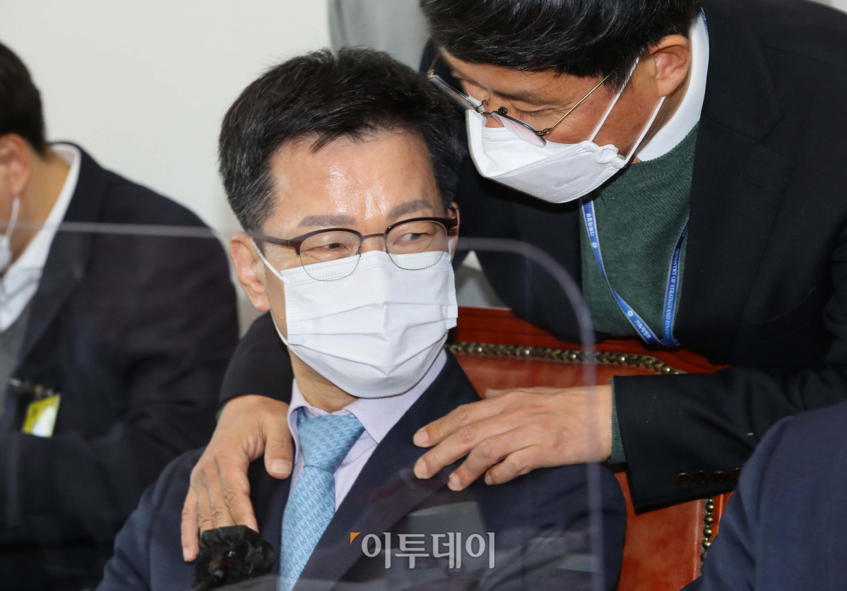 이정도 청와대 총무비서관이 23일 국회 예산결산특별위원회 예산안등조정소위원회에서 안도걸 기획재정부 예산실장과 인사하고 있다.