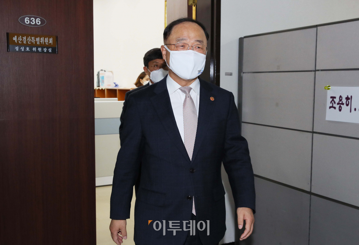 홍남기 부총리 겸 기획재정부 장관이 23일 국회 예산결산특별위원회 예산안등조정소위원회를 앞두고 정성호 예결위원장을 예방하고 나오고 있다.