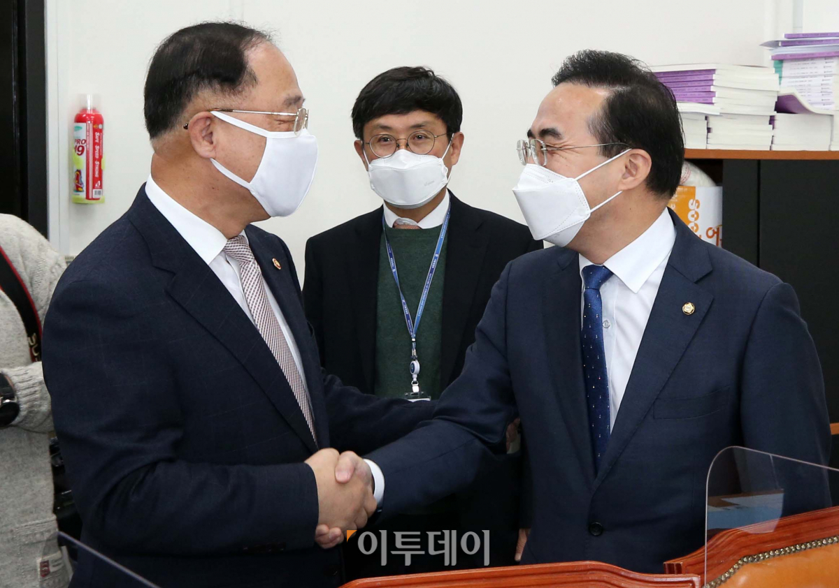 홍남기 경제부총리 겸 기획재정부 장관(왼쪽)이 23일 오전 서울 영등포구 여의도 국회에서 열린 예결위 소위를 찾아 박홍근 더불어민주당 예결위 간사와 인사를 나누고 있다.