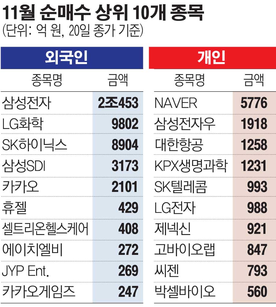 이 기간 외국인 투자자들이 가장 많이 사들인 종목은 삼성전자로, 순매수액이 2조453억 원에 달한다. 순매수 2위인 LG화학(9801억 원)보다 1조 원 이상 많다. 3위는 SK하이닉스(8904억 원)이었고 다음은 삼성SDI(3173억 원)이 뒤를 이었다. 반도체와 2차 전지주가 주를 이룬 셈이다. 또한 카카오도 2101억 원 순매수하며 기대감을 숨기지 않고 있다.
