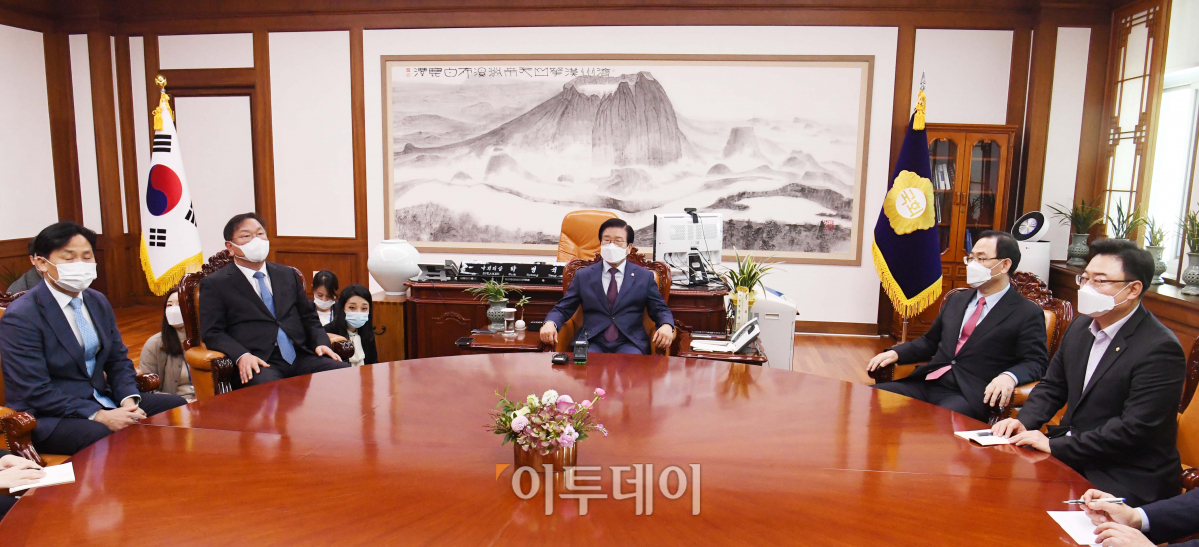 23일 오후 국회 의장실에서 김태년 민주당 원내대표(좌측 두번째) 와 주호영 국민의힘 원내대표(우측에서 두번째)가 박병석의장 주재로 '공수처법 해법' 을 논의하기 위해 회동했다.
