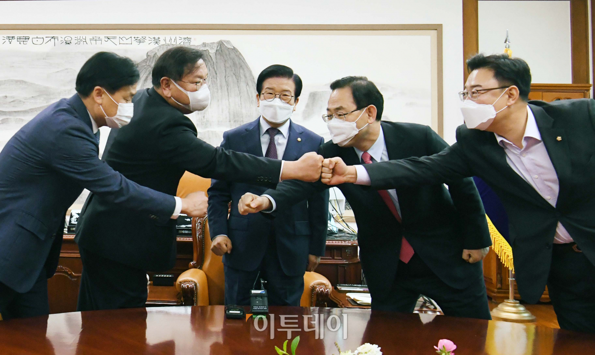 23일 오후 국회 의장실에서 민주당 김태년 원내대표(좌측 두번째) 주호영 국민의힘 원내대표(우측에서 두번째)가 박병석의장 주재로 '공수처법 해법' 을 논의하기 위해 회동했다.