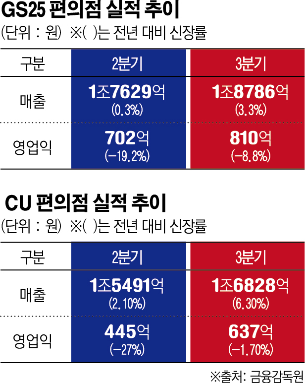 실제 GS25의 2분기와 3분기 매출은 각각 0.3%, 3.3%를 기록하며 브레이크가 걸렸고, 영업이익은 -19.2%, -8.8%로 역신장했다. CU 역시 2분기와 3분기 영업익이 각각 27.0%, 1.7% 뒷걸음질치며 수익성이 악화됐다.
