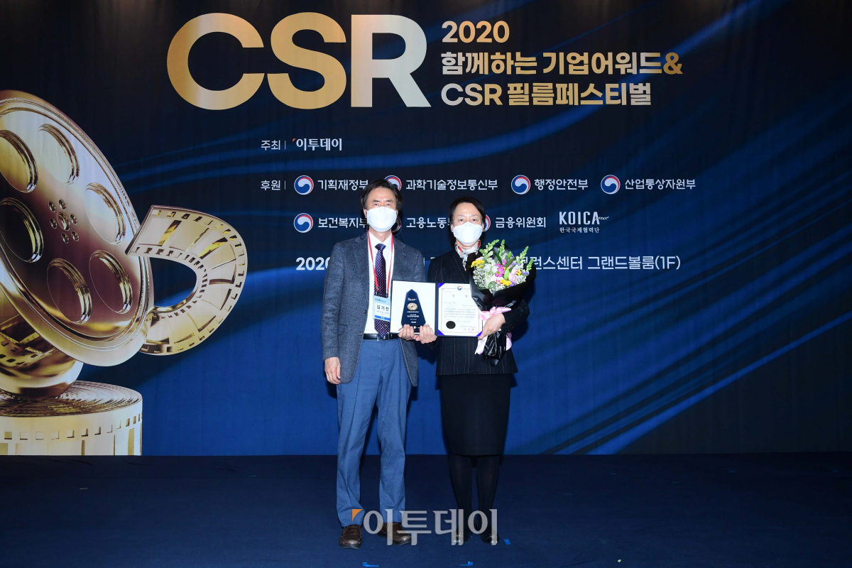 26일 서울 여의도 전경련회관에서 열린 ‘2020 함께하는 기업 어워드 & CSR 필름페스티벌’에서 산업통상자원부장관상을 수상한 방미정 포스코1%나눔재단 그룹장과 시상자인 김기찬 가톨릭대 경영대 교수가 기념촬영을 하고 있다. 이투데이가 주최하는 ‘함께하는 기업 어워드 & CSR 필름페스티벌’은 보다 나은 우리 사회를 위한 선한 영향력의 연대 확장을 목적으로, ‘사회가치 경영’이란 지속가능한 기업 비즈니스모델 혁신과 ‘기업시민 의식제고’를 목표하여 올해로 9회째 진행 중인 대한민국 대표 CSR 행사다.