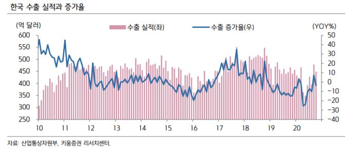 키움증권은 이날 20일까지 한국의 수출금액이 전년 같은 달 대비 11.1% 증가했다고 언급했다. 이 기간 조업일수가 16일로 지난해(15.5일)보다 0.5일 많은 부분도 있으나 하루평균 수출액 기준으로 봐도 전년 같은 달 대비 7.6% 증가했다.