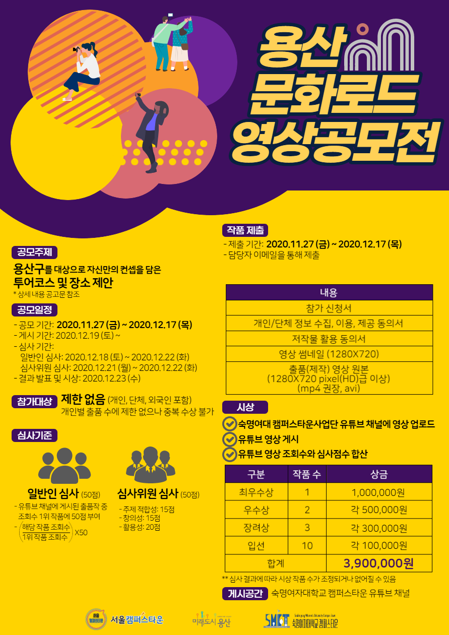 용산구와 숙명여자대학교 캠퍼스타운 사업단은 금일 11월 27일부터 용산구의 문화, 자연 및 여러 명소를 배경으로 용산구만의 문화로드를 발굴하고 대내•외적으로 홍보할 수 있는 양질의 영상 콘텐츠를 확보하고자 ‘용산 문화로드 영상공모전’ 이벤트를 진행한다.