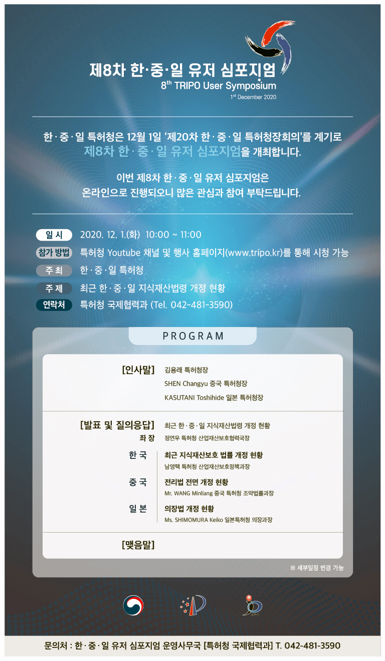 올해 심포지엄은 코로나 19로 인해 온라인 송출 방식으로 3국에 동시 중계될 예정이며, 특허청 공식 유튜브 채널 또는 한·중·일 유저 심포지엄 공식홈페이지(www.tripo.kr)를 통해 참여할 수 있다. 한국어, 중국어, 일본어 자막을 함께 제공한다.