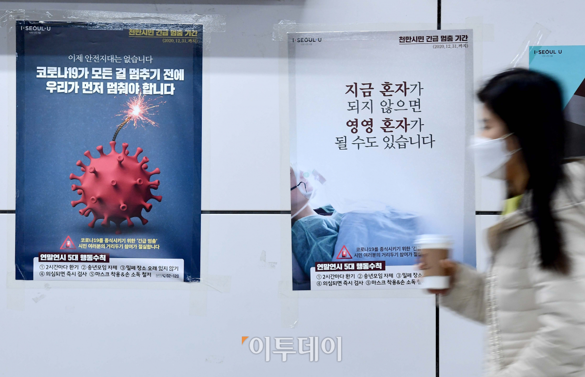 서울 지하철 운행이 27일 오후 10시부터 20% 줄어들고 수도권 전철 1호선과 4호선 등도 종착역 기준 막차 시간이 0시 30분으로 단축된다. 지난 24일 서울 시내버스 야간 감축 운행에 이어 코로나19 수도권 확산에 따라 조기 귀가를 유도하기 위한 조치다. 이날 서울 구로구 신도림역에 ‘천만시민 긴급 멈춤 기간’ 포스터가 게시돼 있다. 신태현 기자 holjjak@