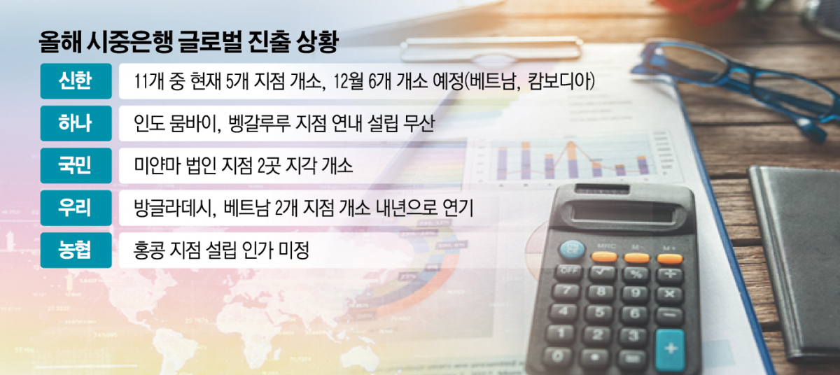 신한은행은 올해 설립하기로 한 총 11개(베트남, 캄보디아) 지점 가운데 현재 5개만 설립을 완료한 상태다. 나머지 6개(베트남 3곳, 캄보디아 3곳)는 내달까지 개점을 마무리할 방침이다.