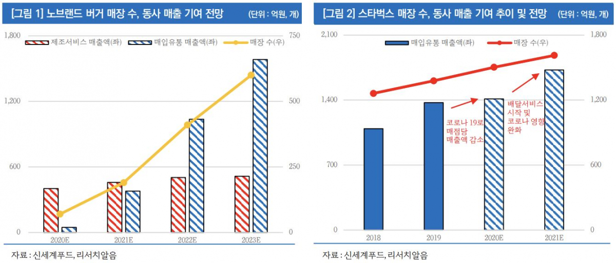 최 연구원은 "올해 국내 스타벅스의 지점당 연평균 매출액은 매장 내 취식 금지 등의 정부 정책에 따라 전년 대비 5.4% 감소할 것으로 추정되는데 배달서비스 시작으로 내년부터 다시 성장 궤도에 진입할 전망"이라면서 "이에 따라 신세계푸드의 스타벅스 향 매출액도 2019년 1373억 원에서 2020년 1413억 원으로 소폭 증가 후 2021년 1724억 원으로 확대될 것으로 예상한다"고 말했다.