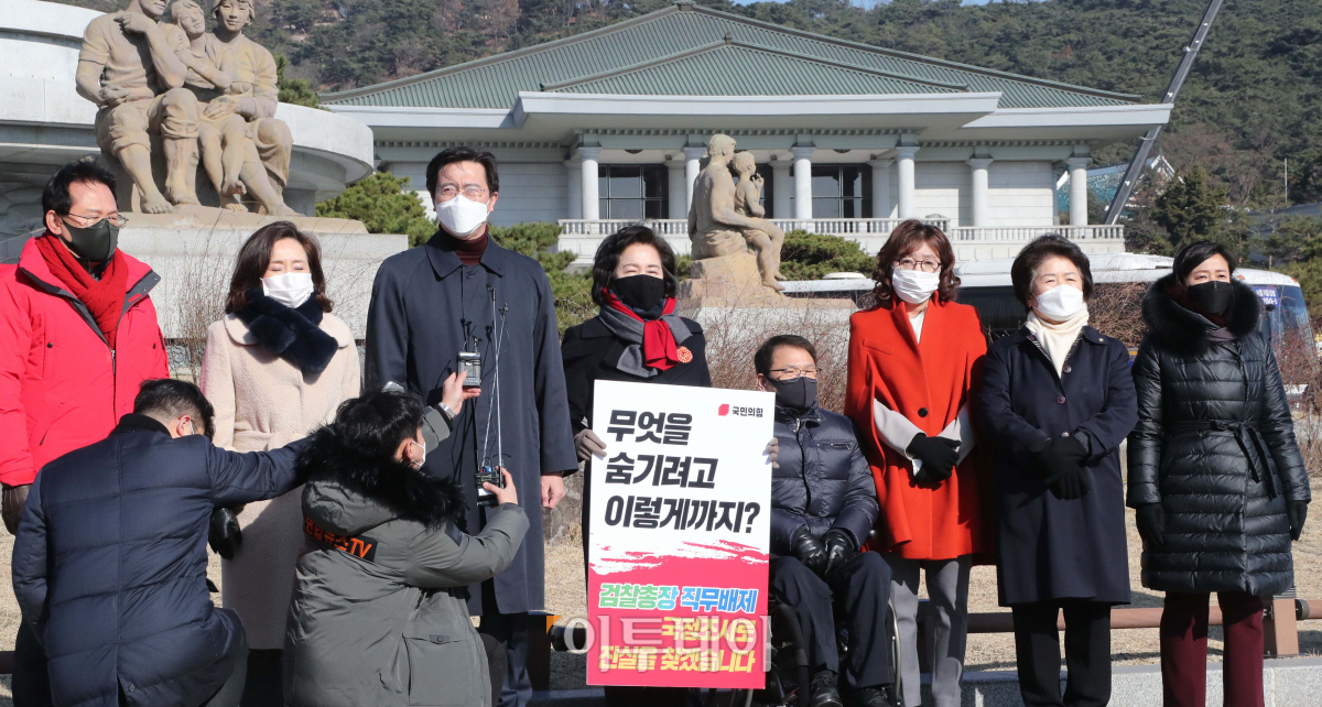 청와대 분수대 앞에서 1인시위을 이어가고 있는 국민의힘 초선 의원들이 30일 추미애 법무부 장관과 윤석열 검찰총장의 갈등에 대한 문재인 대통령의 입장표명을 요구하는 기자회견을 하고 있다. 좌부터 윤두현 전주현 강민국 조명희 이종성 양금희 서정숙 황보승희 의원. 국회사진취재단