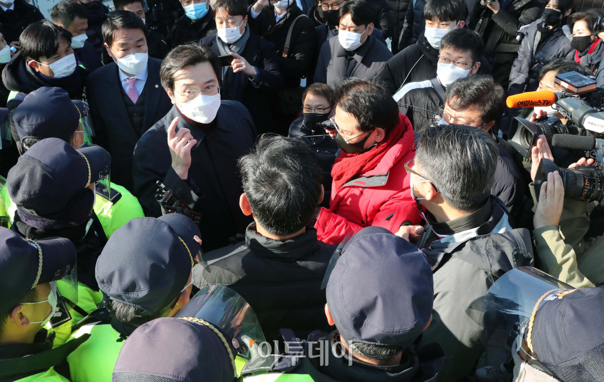 추미애 법무부 장관과 윤석열 검찰총장의 갈등에 대한 문재인 대통령의 입장표명을 요구하며 국민의힘 초선의원들이 청와대 분수대 앞에서 1인시위을 이어가고 있는 가운데 30일 윤두현(빨강 점퍼), 강민국 의원 등이 질의서를 전달하기 위해 청와대로 향하자 경찰이 제지하고 있다. 국회사진취재단
