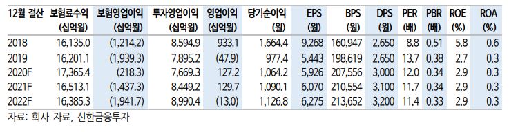 자회사인 삼성증권 관련 손상차과 서소문 빌딩 멸실 관련 비용이 약 2000억 원 인식된다. 변액보험 보증준비금 추가 적립 관련 우려는 크지 않다. 손익 민감도는 코스피 100pt당 약 400억 원, 금리 10bp당 50억 원 수준으로 알려져 있다.