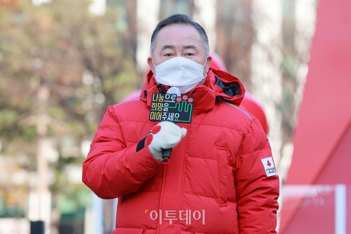예종석 사랑의열매 회장이 1일 오후 서울시청 광장에서 열린 '사랑의열매, 희망2021나눔캠페인 출범식'에 참석해 인사말을 하고 있다.