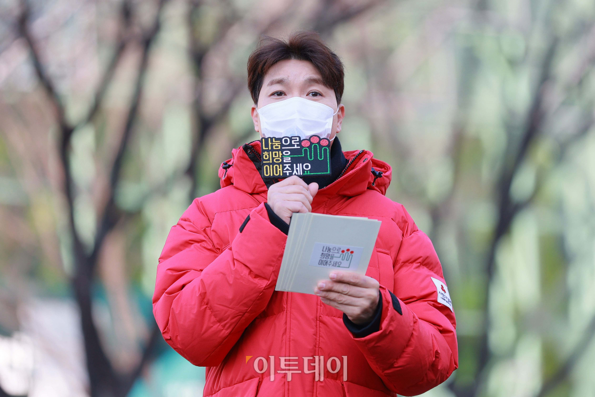 사랑의열매 홍보대사 방송인 박수홍이 1일 오후 서울시청 광장에서 열린 '사랑의열매, 희망2021나눔캠페인 출범식'에 참석해 인사말을 하고 있다.