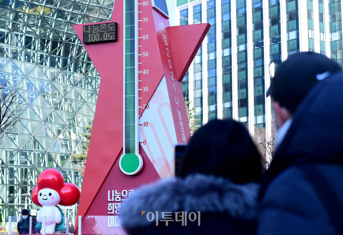 1일 서울 중구 서울광장에 ‘사랑의 온도탑’이 설치돼 있다. 사랑의열매 사회복지공동모금회는 이날부터 내년 1월 31일까지 연말연시 이웃돕기 캠페인 ‘희망 2021 나눔 캠페인’을 진행한다. 올해 목표액은 코로나19와 호우피해로 연중 특별 모금이 진행된 점을 고려해 4257억원에서 3500억원으로 하향 조정됐다. 서울 지역 목표액은 393억 원이다. 전국 17개 시·도에 설치되는 사랑의 온도탑은 나눔 목표액의 1%인 35억이 모일 때마다 수은주가 1도씩 올라간다.