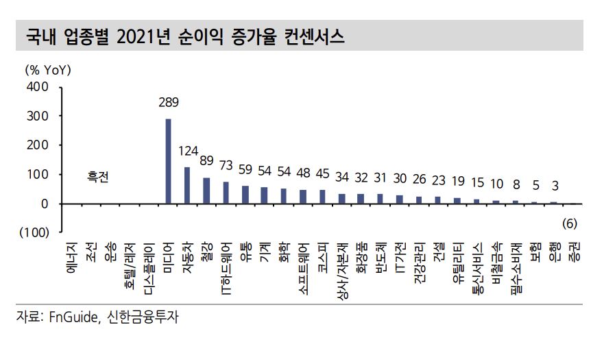 신한금융투자에 따르면 2021년 순이익은 전년 대비 45% 늘어날 것으로 예상하면서 증권을 제외한 모든 업종이 플러스 이익 증가율을 기대하고 있다.