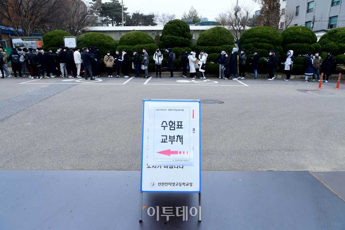 2021학년도 대학수학능력시험 예비소집일인 2일 서울 용산구 선린인터넷고에서 학생들이 수험표를 교부받기 위해 줄지어 서 있다.