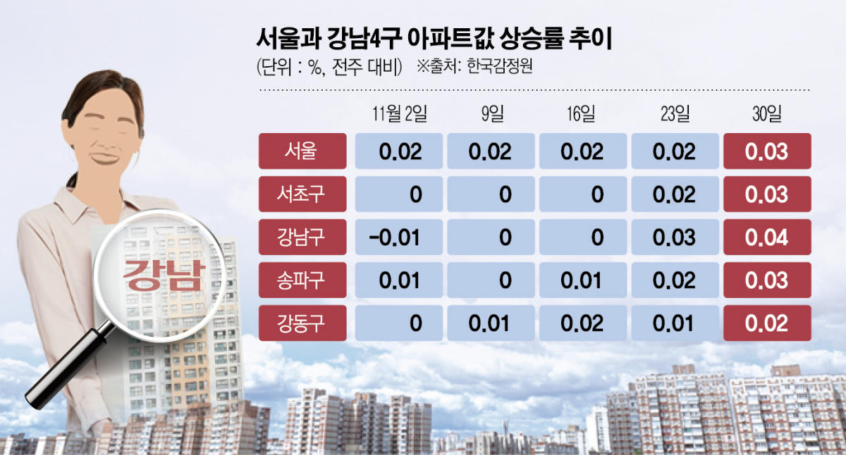 서초구와 송파구는 나란히 0.02%에서 0.03%로 확대됐다. 강동구도 0.01%에서 0.02%로 상승폭을 키웠다.