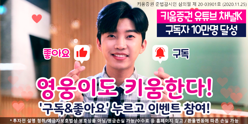 키움증권은 유튜브 구독자 10만 명 돌파를 기념해 유튜브 10만 돌파 이벤트 영상에 축하 댓글 작성하고 SNS로 공유하면 각종 상품을 제공하는 이벤트를 진행한다.