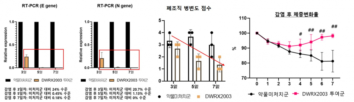 특히, 대웅제약은 DWRX2003이 단회투여 만으로 3일차부터 바이러스가 약 76~80% 감소한 항바이러스 효과를 나타냈으며, 5일차부터는 폐조직에서 상대적으로 바이러스 유전자가 거의 발현되지 않는 것을 확인했다. 또, 대웅제약은 폐의 조직병리결과 병변도 점수가 미처리군의 평균 3점 전후에서 DWRX2003를 투여받은 군은 평균 1점 전후로 개선됐고, 바이러스 감염 및 병세악화에 따라 나타나는 햄스터의 체중 감소 경향도 완화되는 것을 확인했다.