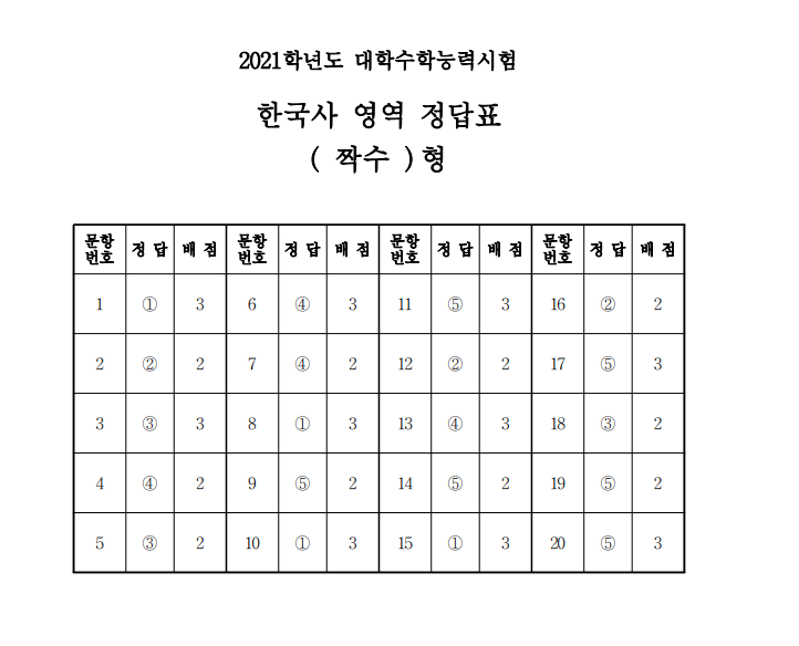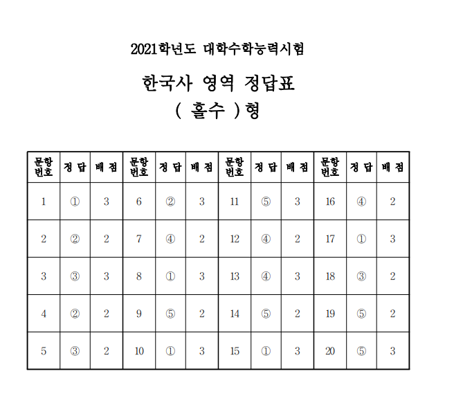 ‘2021학년도 대학수학능력시험’(2021학년도 수능)이 3일 치러진 가운데 4교시 한국사 과목 정답이 발표됐다.
