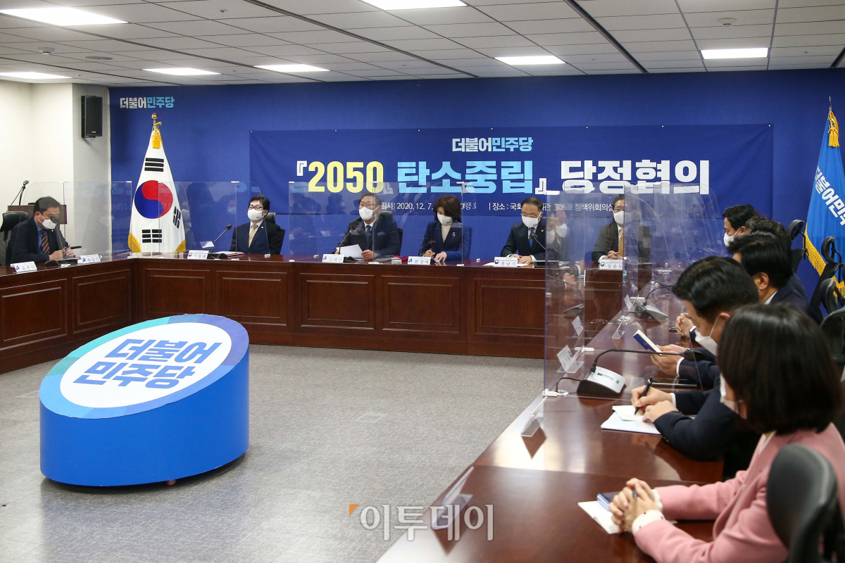 더불어민주당 김태년 원내대표와 홍남기 경제부총리 겸 기획재정부 장관 등이 7일 국회에서 ‘2050 탄소중립 실현 당정협의’에 참석하고 있다.