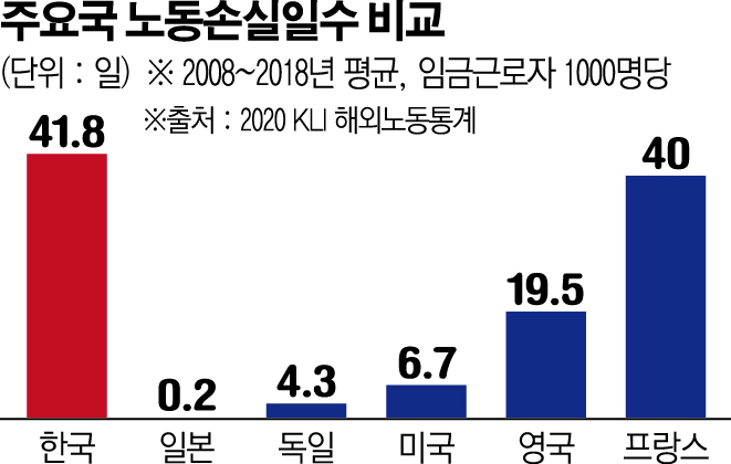 전국경제인연합회 산하 한국경제연구원은 2008년부터 2018년까지 한국과 G5(미국ㆍ일본ㆍ독일ㆍ영국ㆍ프랑스)의 노사관계지표를 분석한 결과 10년 평균 ‘임금근로자 1000명당 노동손실일수’는 한국이 41.8일로 가장 많았다고 7일 밝혔다.