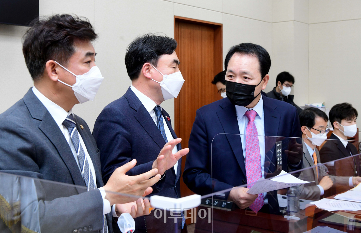 7일 서울 여의도 국회에서 열린 정무위원회 전체회의에서 '사회적 참사 진상규명 및 안전사회 건설 등을 위한 특별법'(사참위법) 개정안과 금융그룹감독법 제정안·공정거래법 개정안 등의 논의를 위한 의사일정 변경안이 상정된 뒤 민주당 간사인 김병욱(왼쪽부터) 의원, 윤관석 위원장, 국민의힘 간사인 성일종 의원이 대화하고 있다.