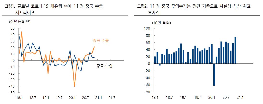 하이투자증권은 8일 "중국의 11월 수출 증가율은 시장 예상치(12%)의 두 배 가까운 전년 동월 대비 21%로 2018년 2월 이후 가장 높은 수출 증가율"이라며 "코로나19(신종 코로나바이러스 감염증) 재유행에도 11월 글로벌 제조업지수 호조와 함께 글로벌 경기 회복 관점에서 긍정적 신호라 평가 할 수 있다"고 분석했다.
