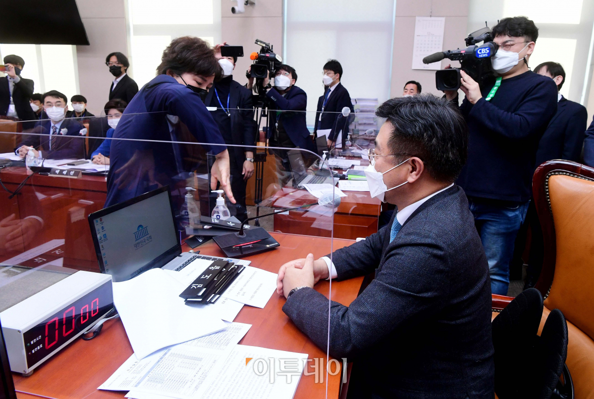 8일 서울 여의도 국회에서 열린 법제사법위원회 전체회의에서 고위공직자범죄수사처(공수처)법 개정안 등이 통과되자 조수진 국민의힘 의원이 명패를 윤호중 위원장에게 내려놓고 있다.