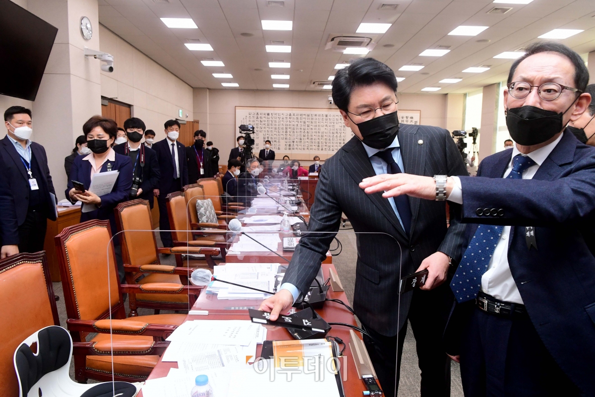 8일 서울 여의도 국회에서 열린 법제사법위원회 전체회의에서 고위공직자범죄수사처(공수처)법 개정안 등이 통과되자 국민의힘 간사인 김도읍 의원과 장제원 의원이 퇴장하고 있다.