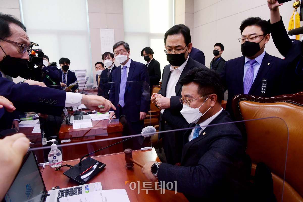 8일 서울 여의도 국회에서 열린 법제사법위원회 전체회의에서 고위공직자범죄수사처(공수처)법 개정안 등의 통과를 위해 윤호중 위원장이 의사봉을 두드리자 주호영 국민의힘 원내대표와 법사위 국민의힘 간사인 김도읍 의원 등이 항의하고 있다.