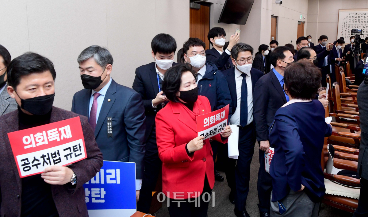 8일 서울 여의도 국회에서 열린 법제사법위원회 전체회의에서 고위공직자범죄수사처(공수처)법 개정안 등이 통과되자 국민의힘 의원들이 퇴장하고 있다.