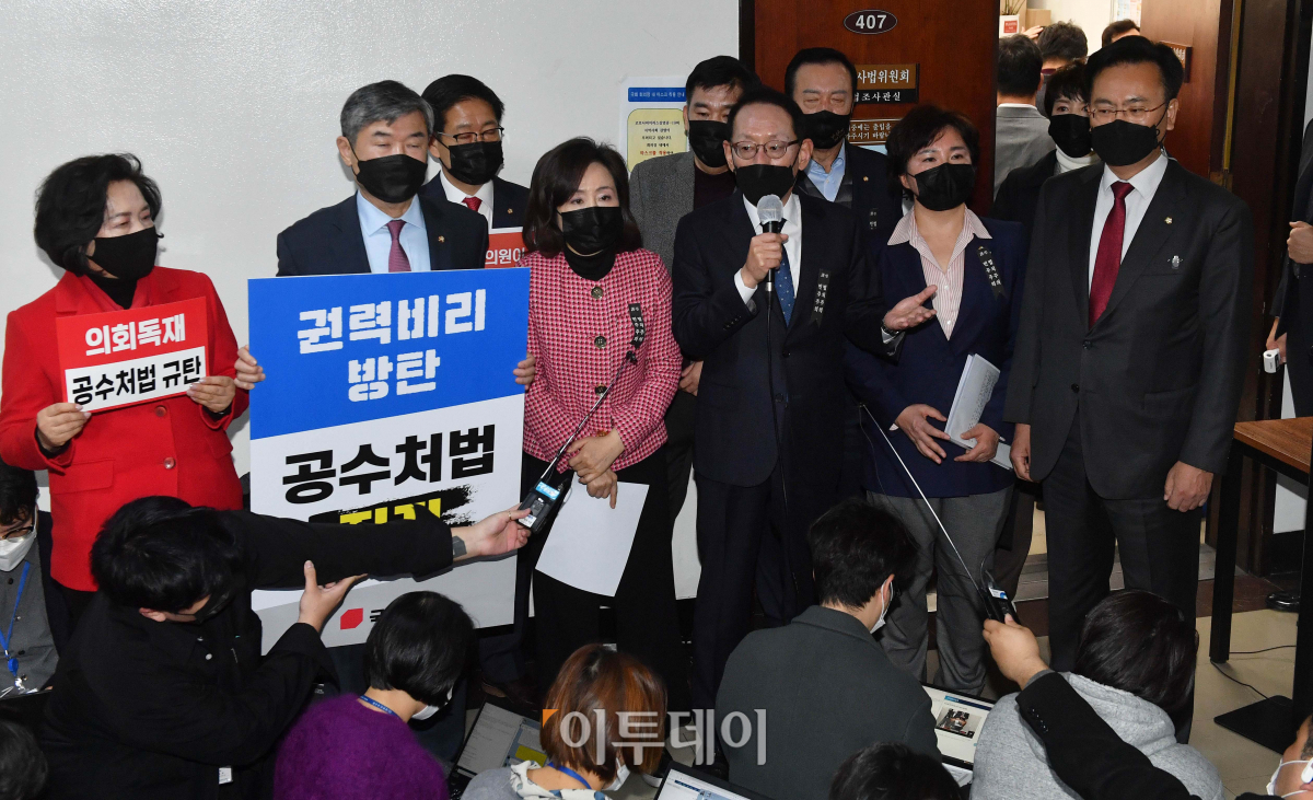국민의힘 소속 김도읍 법제사법위원회 간사와 위원들이 8일 오전 서울 여의도 국회에서 열린 법제사법위원회 전체회의에서 공수처법 개정안이 통과된 뒤 회의실 앞 복도에서 발언하고 있다.