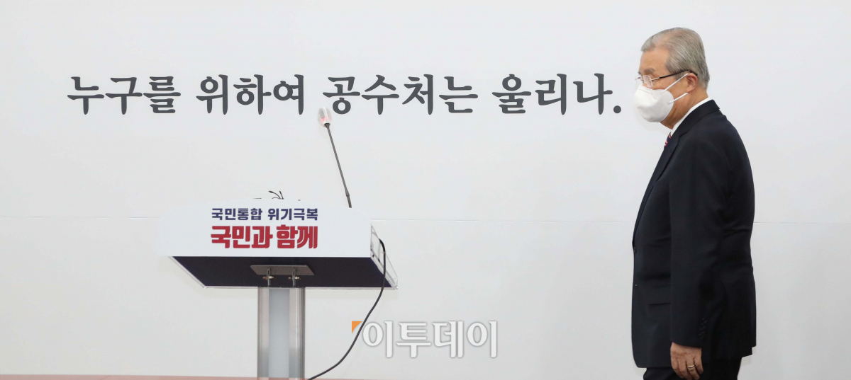 국민의힘 김종인 비상대책위원장이 8일 오후 더불어민주당의 공수처법 강행처리와 관련한 긴급기자회견을 위해 주호영 원내대표와 함께 회견장에 들어서고 있다.