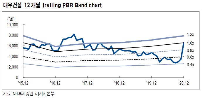 그러면서 "내년부터 본격적으로 회복되는 국내 건설경기에도, 여전히 어려운 해외 건설시장 등을 감안하면 업종 자체의 밸류에이션 리레이팅(가치 재평가)을 기대하긴 어려운 상황"이라며 "반면 2021년 실적 기준 대우건설의 주가수익비율(PER)은 3.7배로 경쟁사 대비 저평가(컨센서스 기준 6개 대형사의 예상 PER은 6.2배)됐다"고 평가했다.