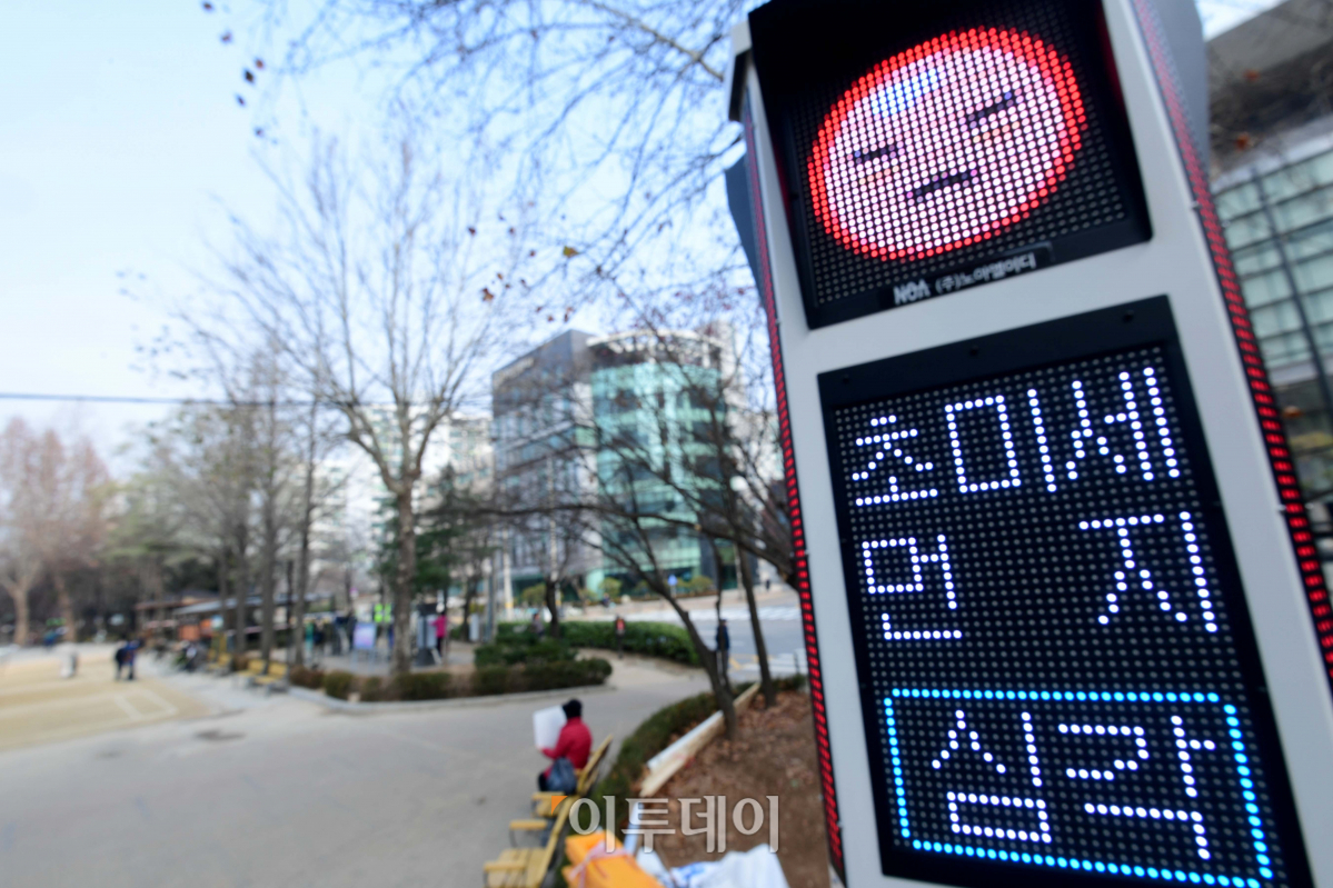 전국 대부분 지역의 미세먼지와 초미세먼지 농도가 ‘나쁨’ 수준을 보인 11일 서울의 한 공원 전광판에 미세먼지 정보가 표시되고 있다.