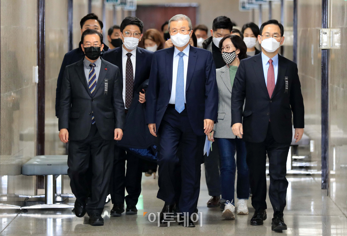 국민의힘 김종인 비상대책위원장과 주호영 원내대표가 14일 오전 서울 여의도 국회에서 열린 비상대책위원회의에 참석하고 있다.