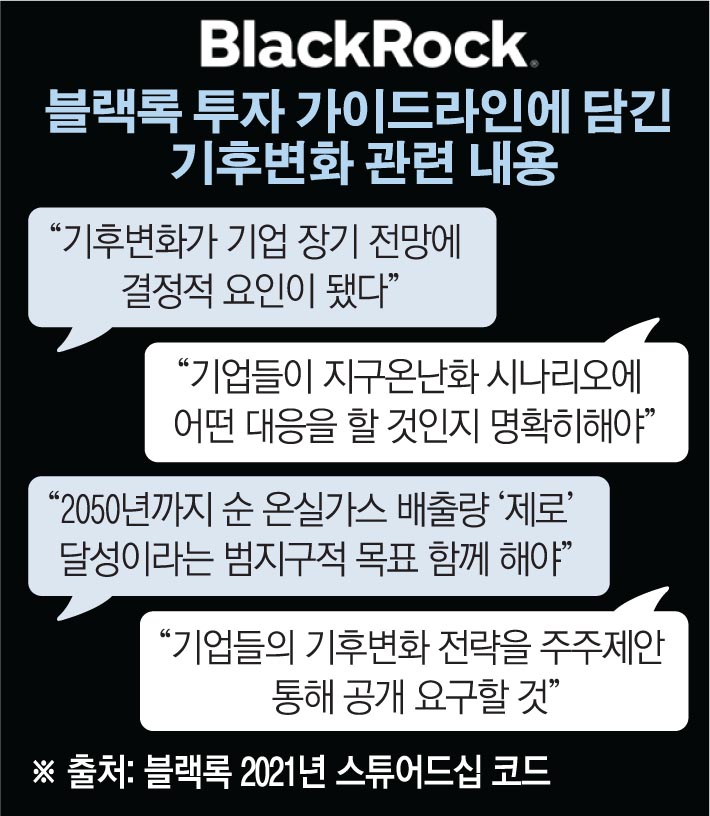 블랙록은 이미 7월부터 주주들이 제기한 9건의 환경 관련 제안 중 8건에 찬성표를 던지며 기업의 기후변화 대응을 촉구하고 나섰다. 또 향후 기후변화 문제에 동참하는 기업의 수를 두 배 넘게 늘려 포트폴리오를 1000곳 이상으로 유지할 방침이다.