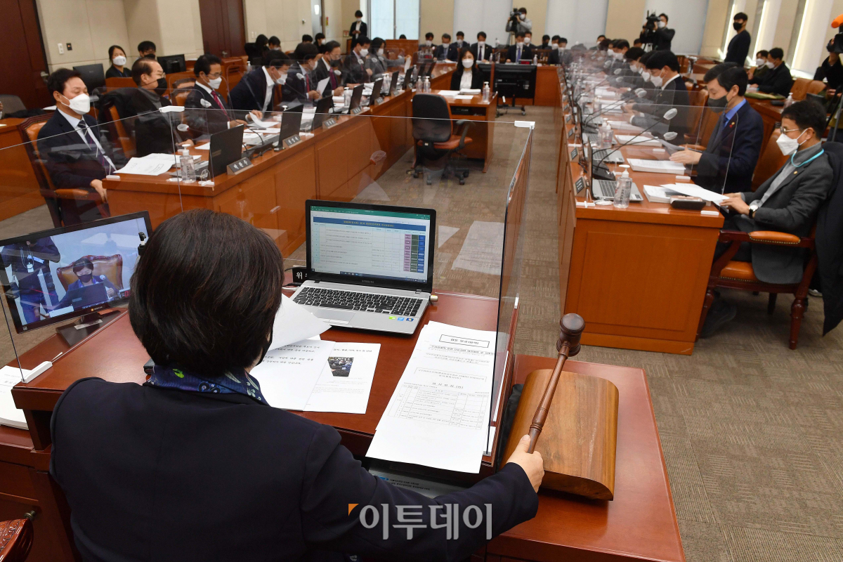 서영교 국회 행정안전위원회 위원장이 14일 오후 서울 여의도 국회에서 열린 행정안전위원회 전체회의에서 안건을 상정하고 있다.